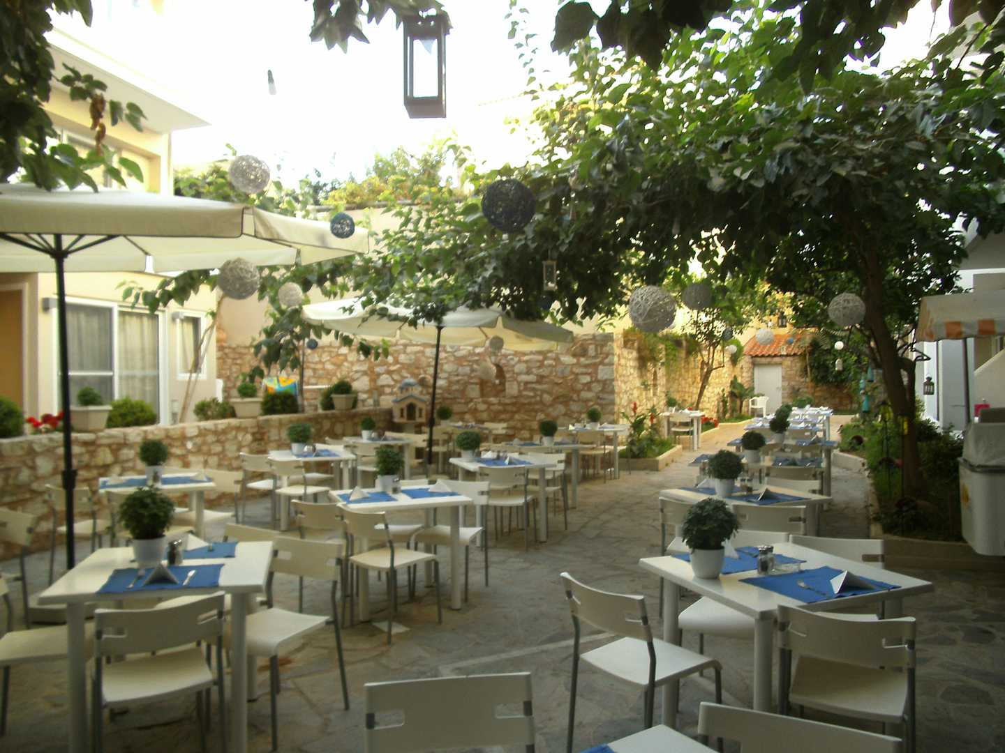 Bestuhlung und Tische im schön dekorierten Innenho
