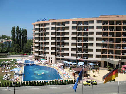 Ansicht für alle, die KEINEN MEERBLICK gebucht haben....! Blick auf das Nachbarhotel Poseidon + Einkaufsmarkt (die ganze Nacht über geöffnet).