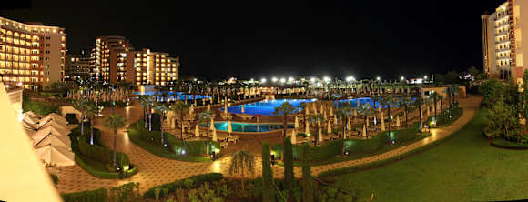Vom Zimmer auf den Pool bei Nacht