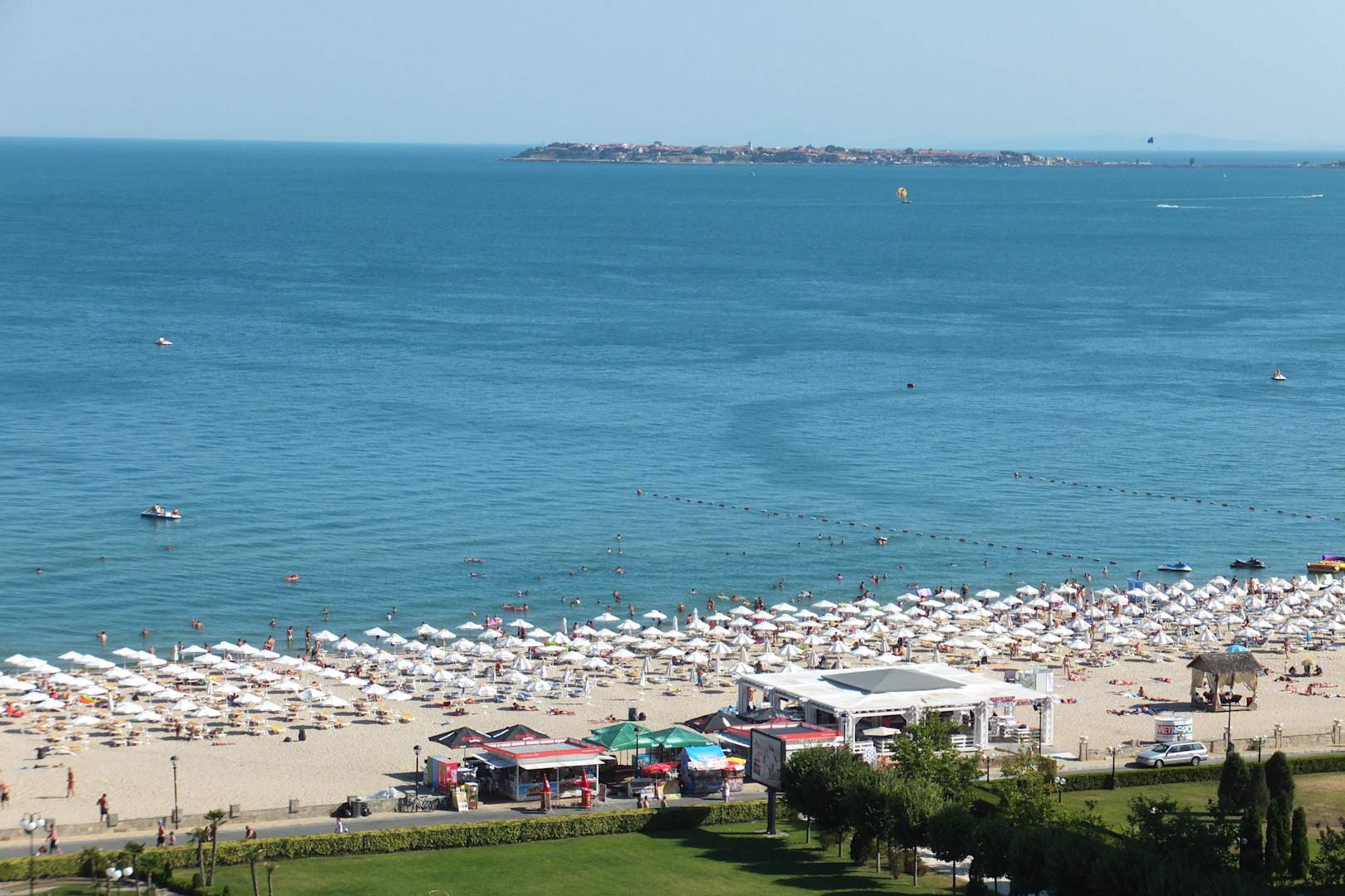 Blick vom Balkon auf den Strand und das Meer