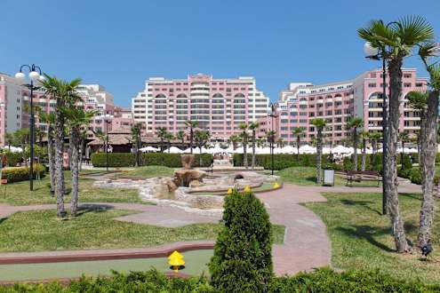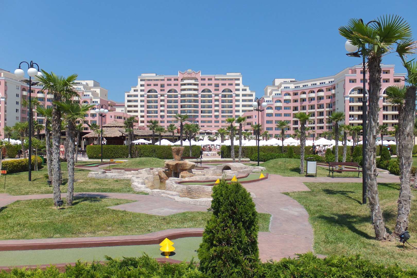 Hotelansicht und Minigolfanlage rechts