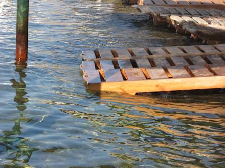 Liegestühle im Wasser bei Flut