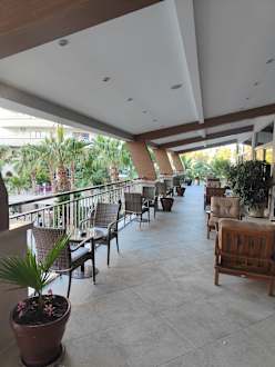 Außenbereich von der Lobby-Bar mit Blick auf den Pool. Sehr gemütlich.