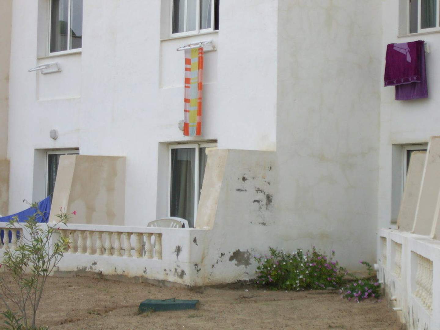 Blick auf unsere TerrasseWie man sieht: dringend renovierungsbedürftig - und darüber vom Zimmernachbarn ein tropfnasses Badetuch...
