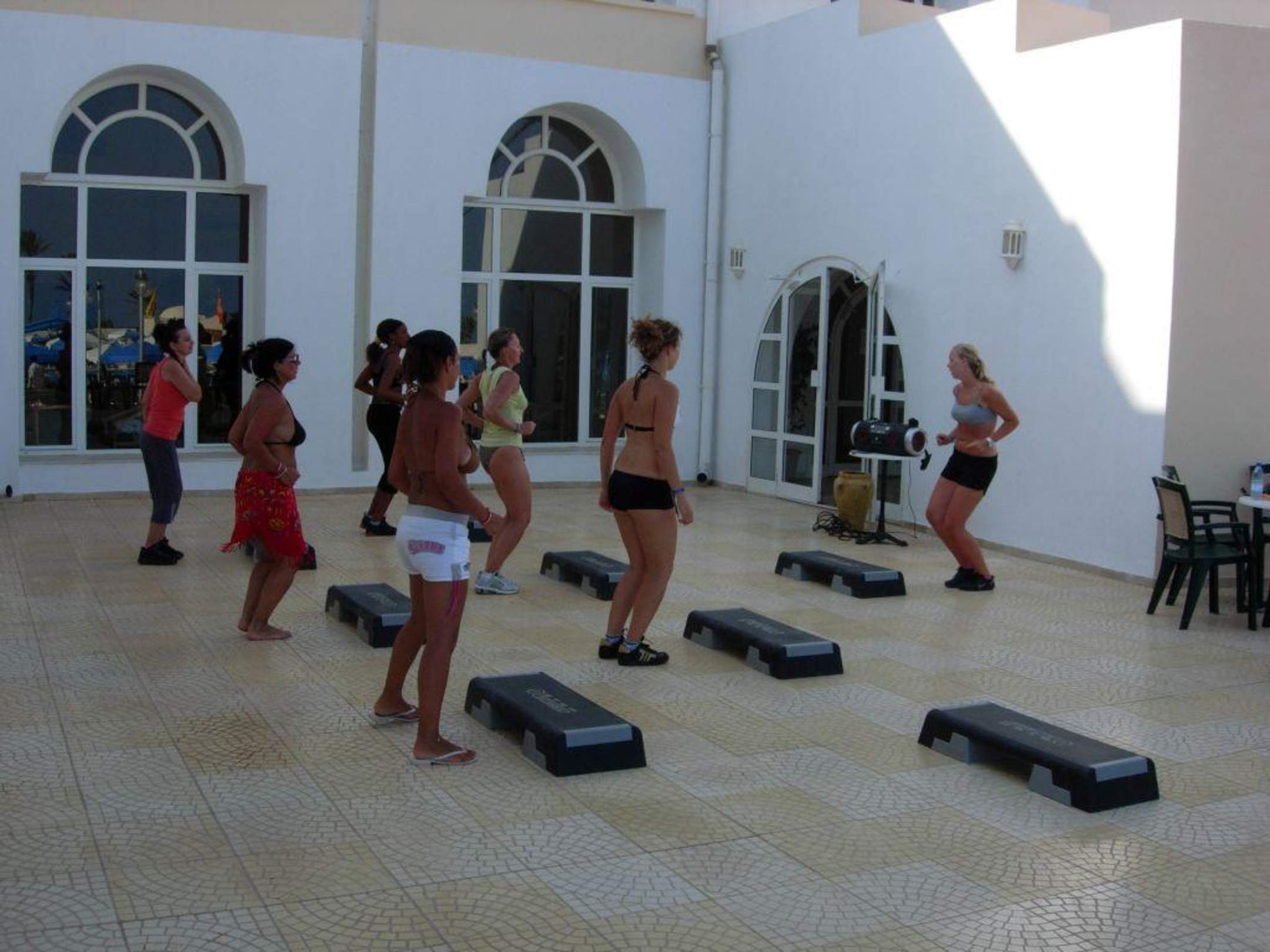Zajęcia Fitness, a dokładnie step aerobic. Zajęcia prowadzane w kilku językach. Te wyjątkowo w języku polskim ze zględu na narodowość pani instruktor. dzięki wielkie