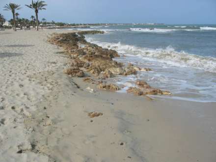 eher Fels als Sandstrand - nur mit Badeschuhen zu empfehlen