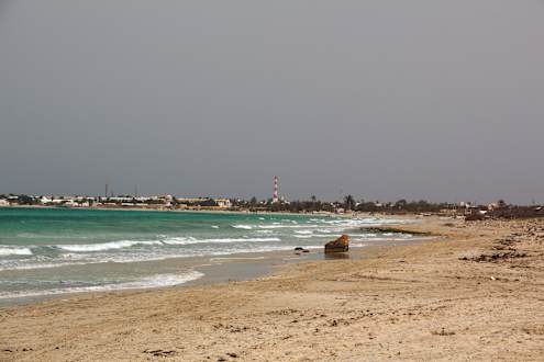 Strand mit Blick Richtung Leuchtturm bei Flut