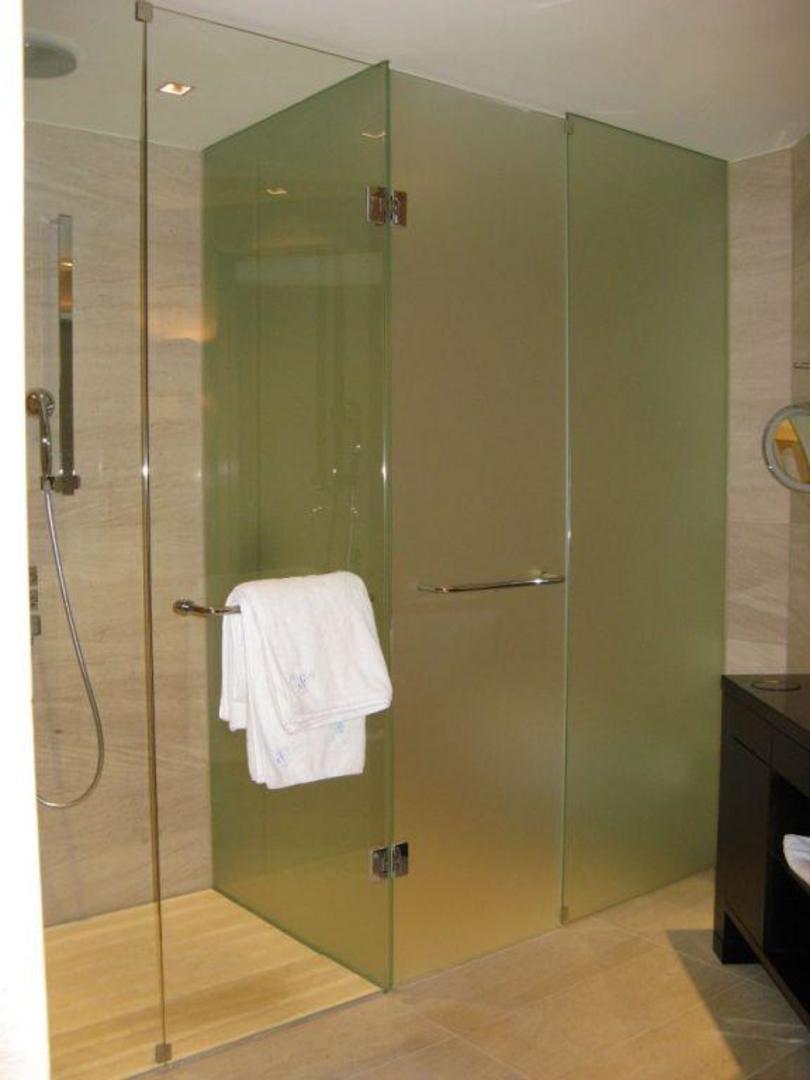 DO & CO Hotel in WienDO & CO Hotel in Wien: Badezimmer mit Dusche und abgetrenntem WC (hinter der rechten Glastüre)