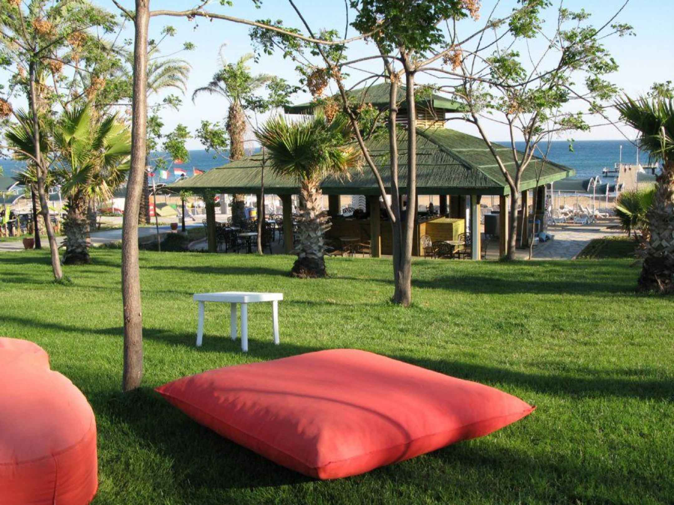 Blick vom Garten auf die Strandbar