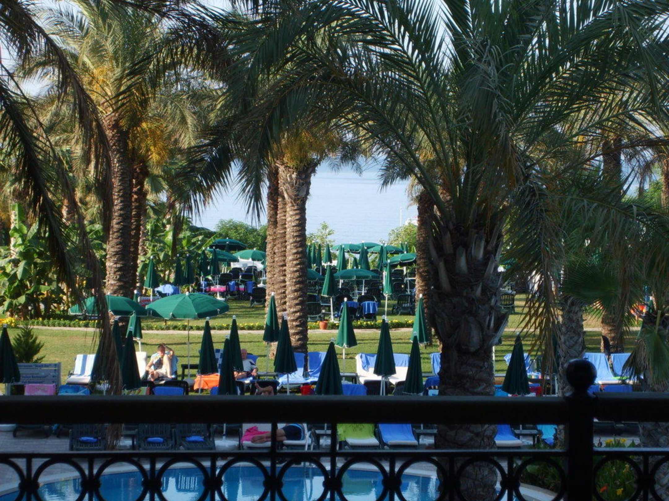 Blick durch Liegen, Garten und Palmen zum Meer