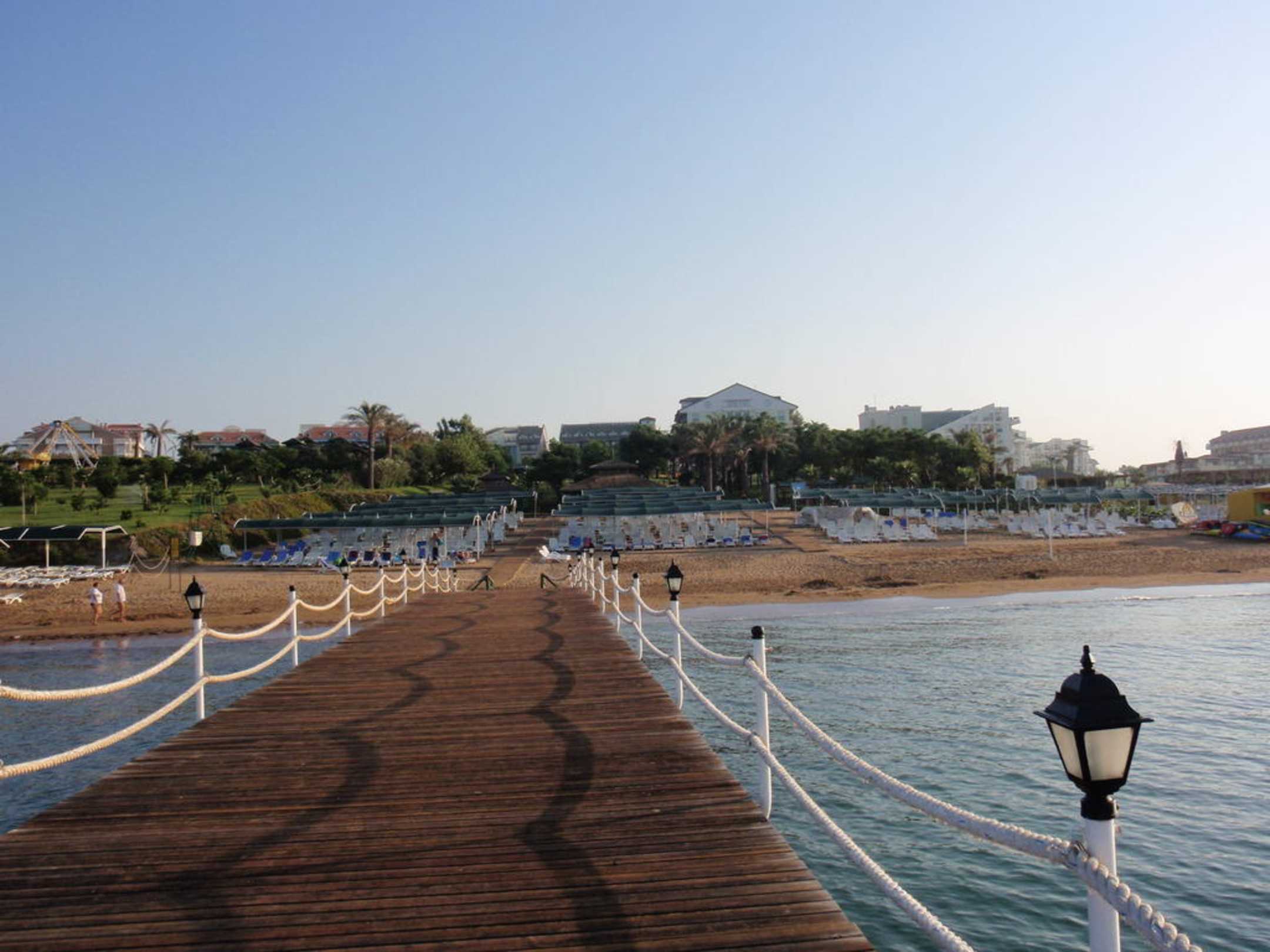 Blick vom Hotelsteg am Strand auf die Hotelanlage