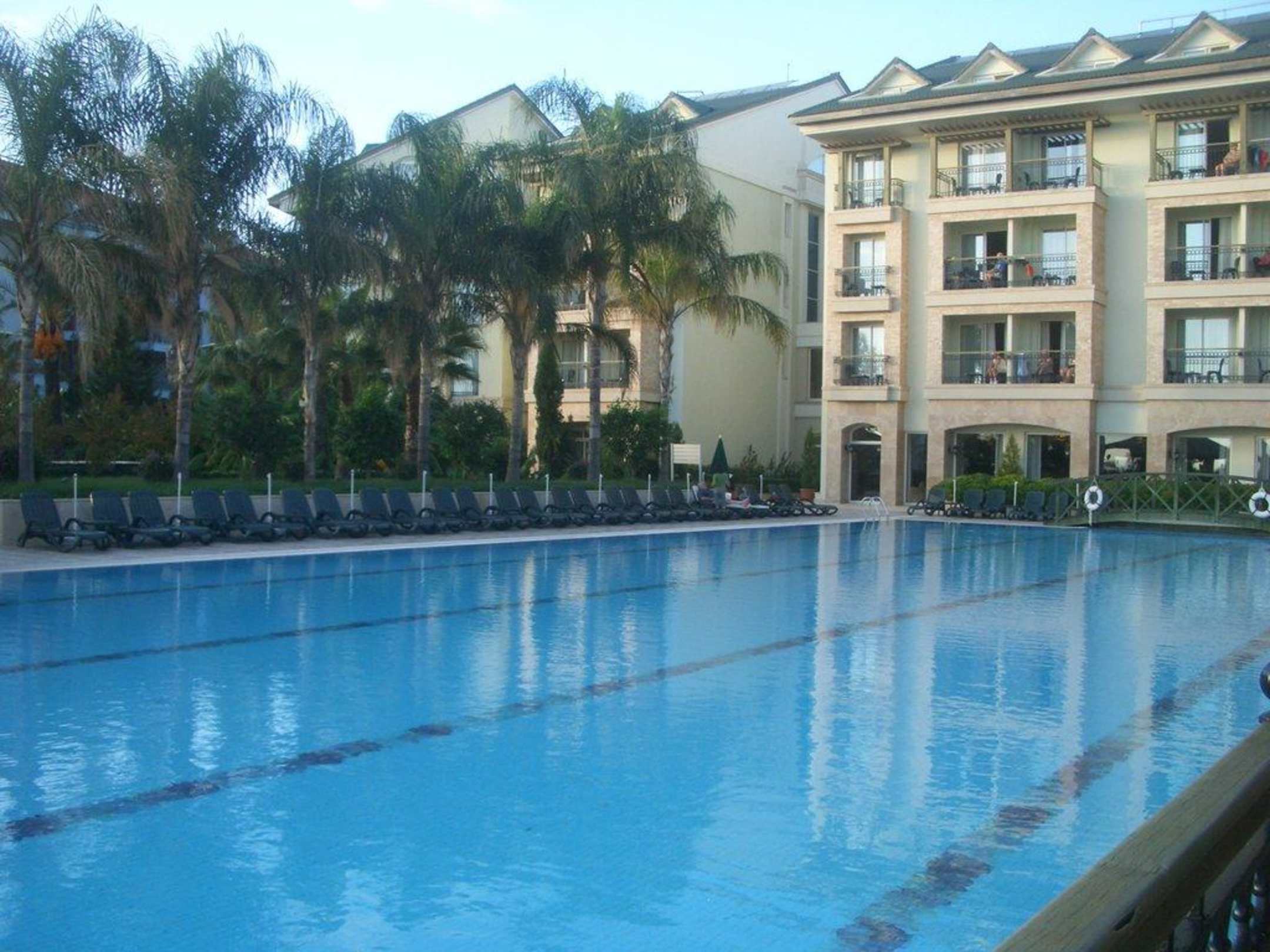 Amara Beach am AbendBlick über den Ruhepool zum Hotel
