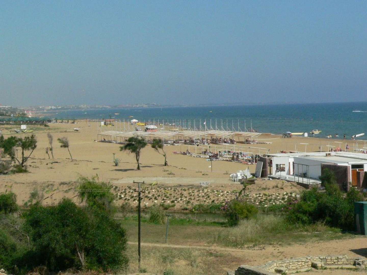 14.30 Uhr Blick von Hotelanlage Richtung Side(rechts hinten). Grüne Sonnendächer über den Strandliegen (links hinten) gehören zum Golden Coast/Golden Beach.