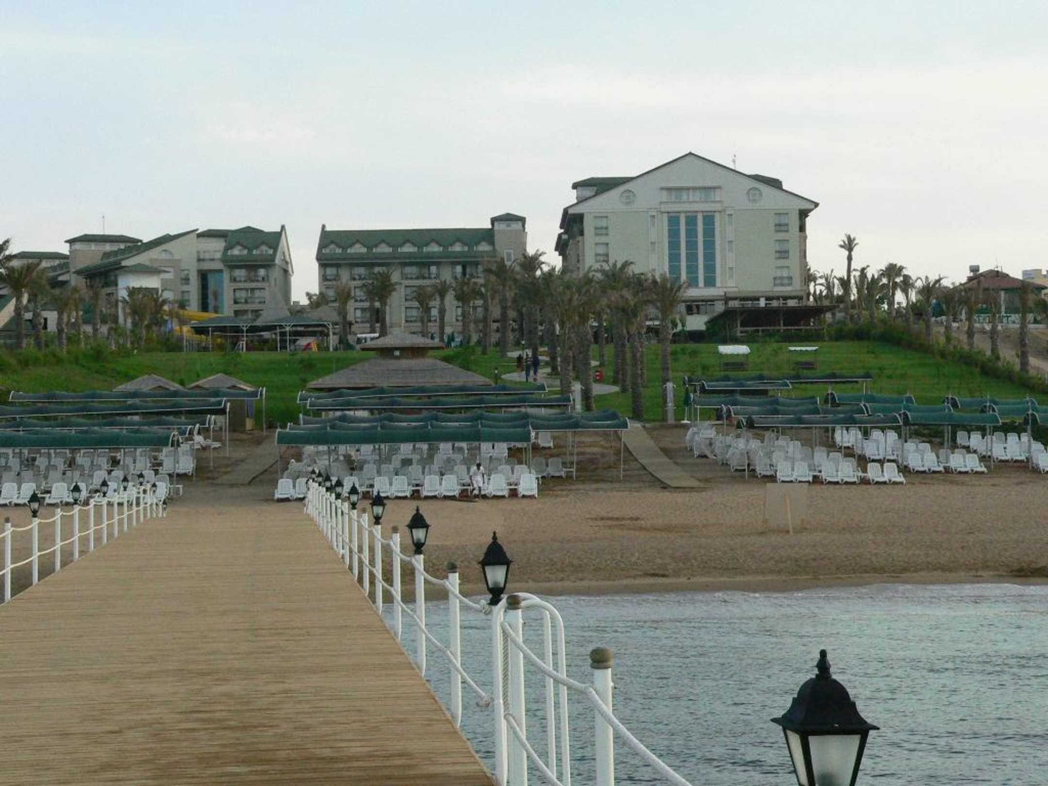 Amara Beach ResortBlick vom Steg auf das Hotel.