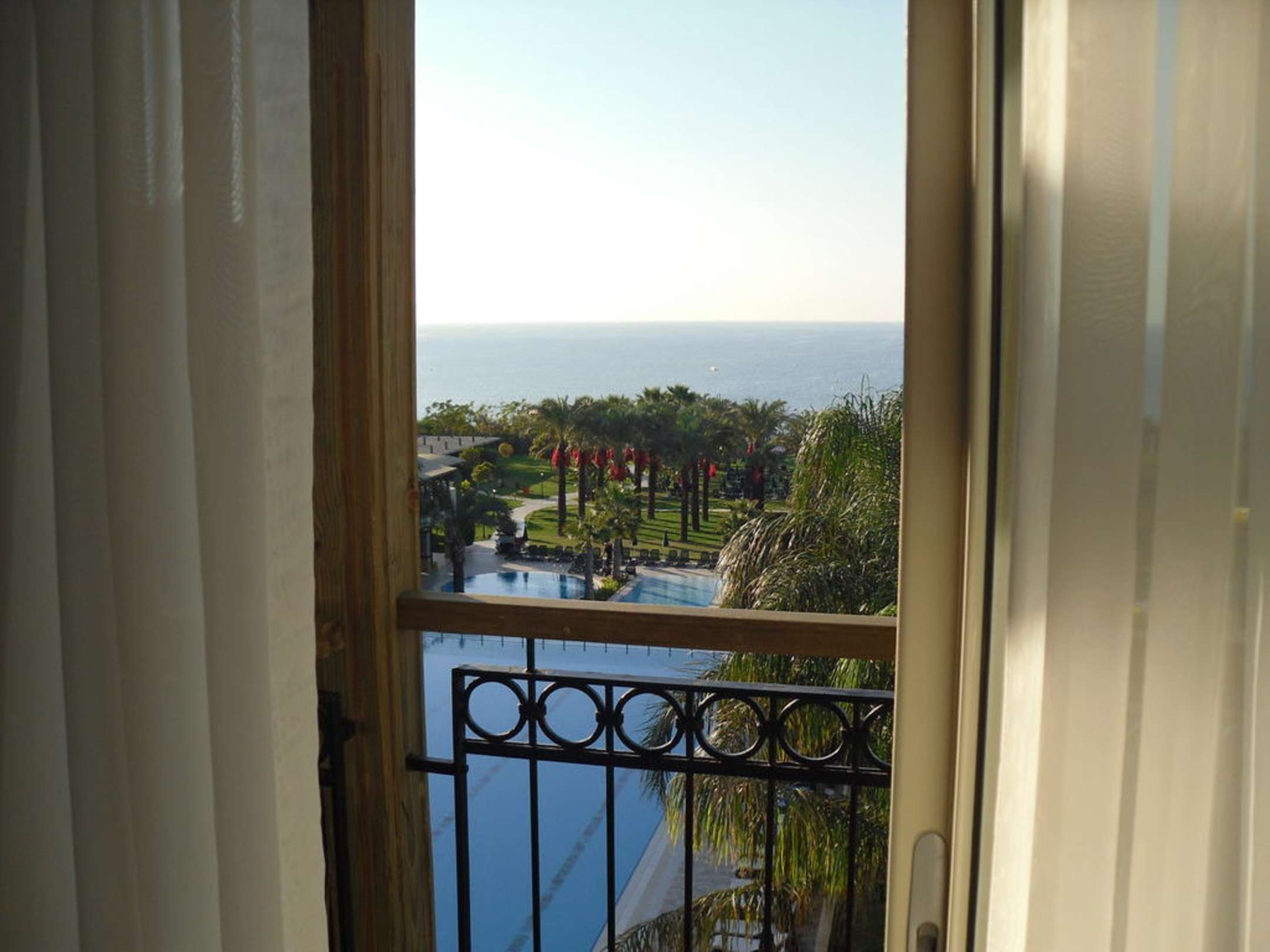 Blick vom Bett aus auf Pool, Garten und Meer