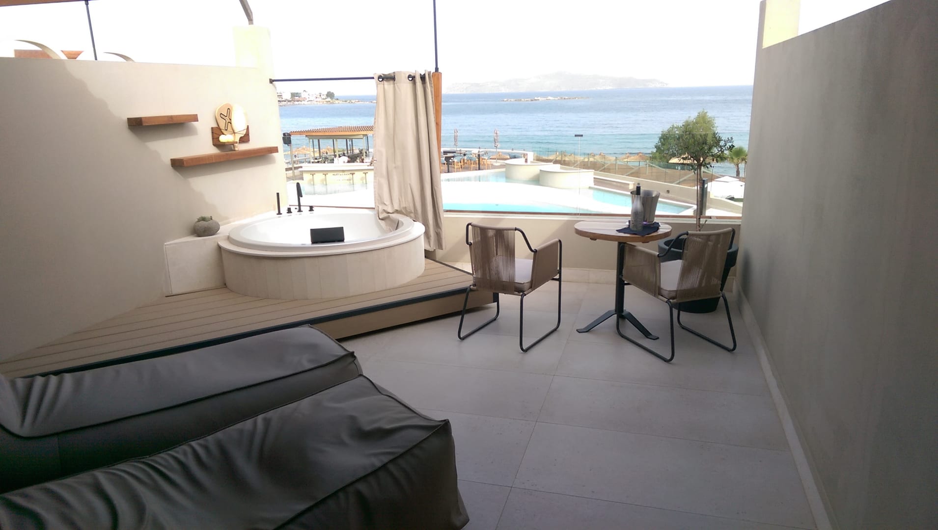 Terrasse mit Badewanne und Sitzgelegenheiten