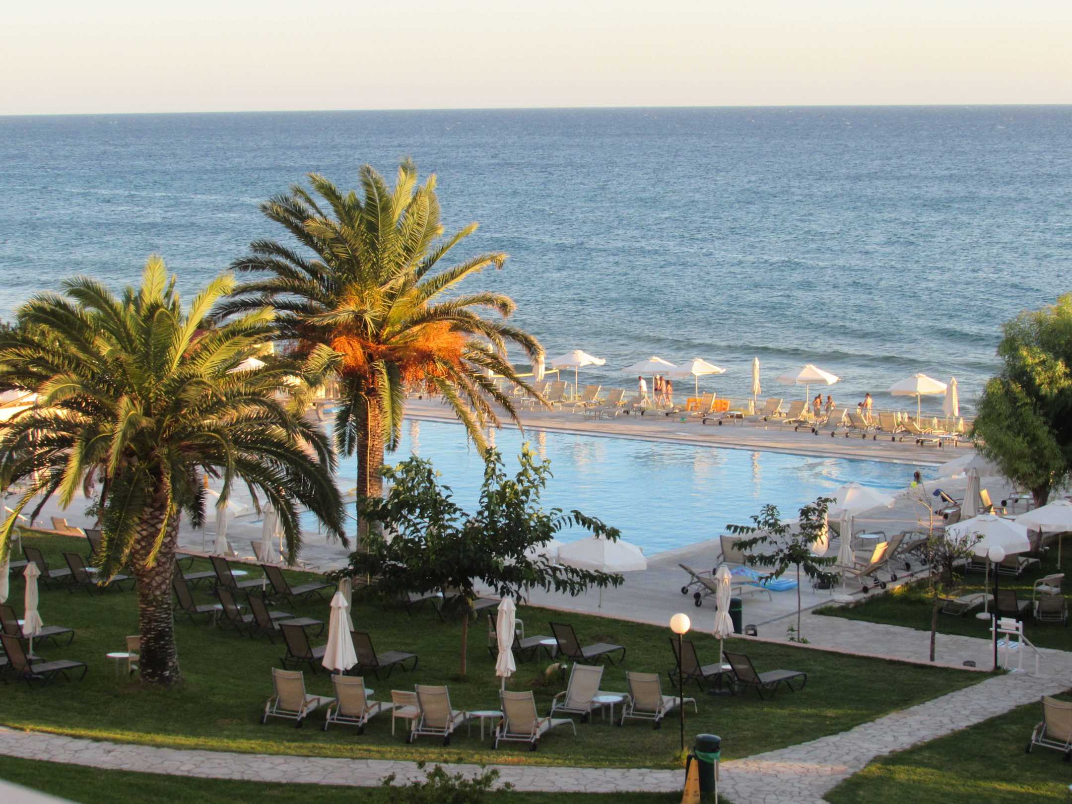 Blick vom Restaurant zum Pool und Meer
