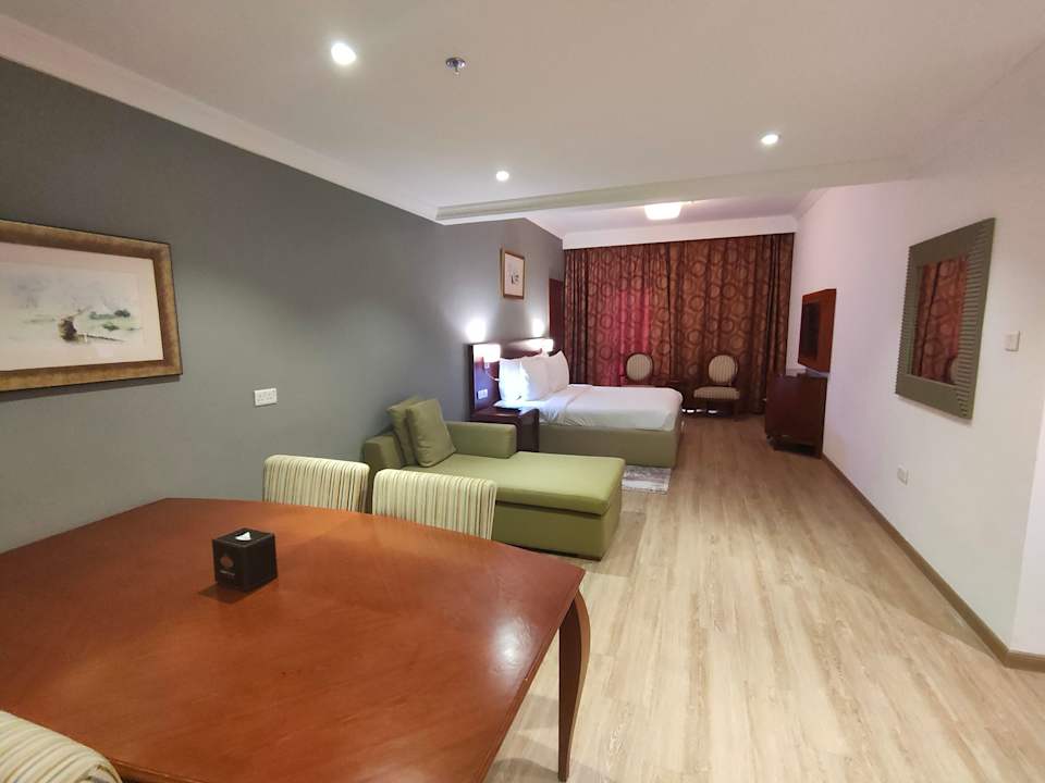 Zimmer mit Esstisch und Sofa