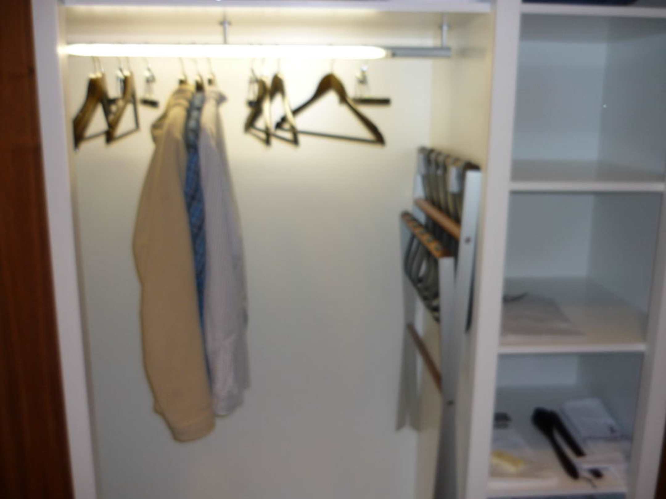 KleiderschrankDer Kleiderschrank wird durch öffnen der Tür beleuchtet. Größe des Schranks ist mehr als gut.