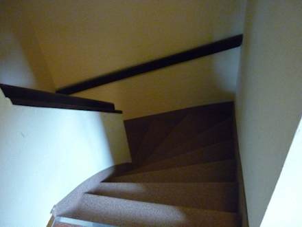Treppe zu den Schlaffzimmern und BadezimmerTreppe zu den beiden Schlaffzimmern und zum großem Badezimmer. Oben gibt es noch Gäste-WC. Da das Haus auf dem Berg ist, geht man nach unten, aber die Zimmer sind dann oberirdisch. Nur deswegen ein wenig dunkel