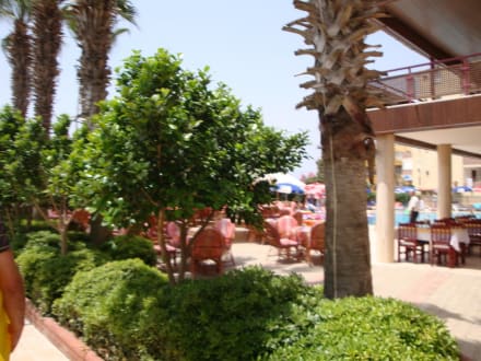 Hinten ist der Pool und rechts wird gegessen