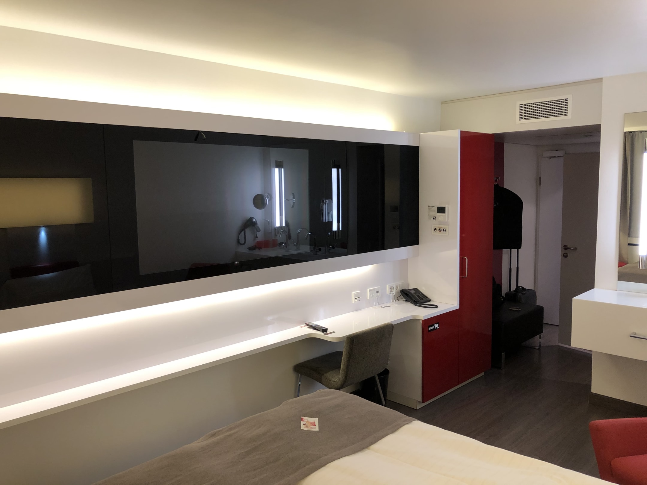 Sehr großer Fernseher, aber nicht optimal platziert um vom Bett bequem schauen zu können. Zum Arbeiten ist der Platz am "Schreibtisch" nicht geeignet.