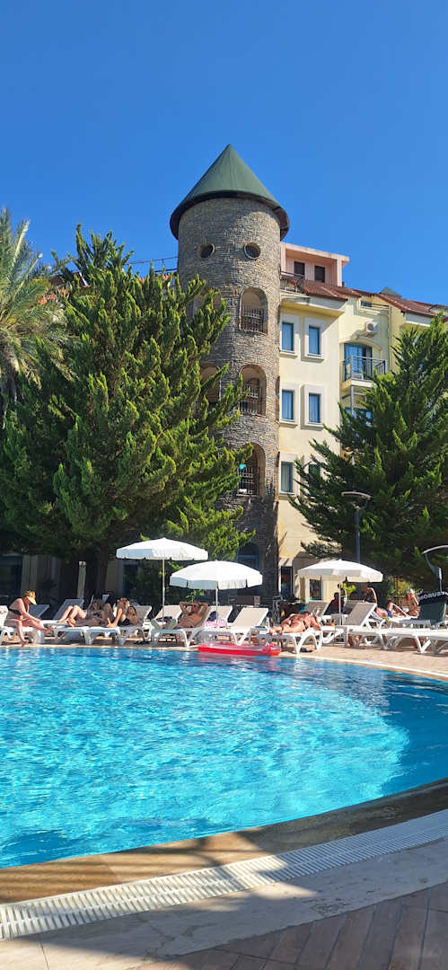 Ruhiger Pool mit genung Liegen und Sonnenschirme.