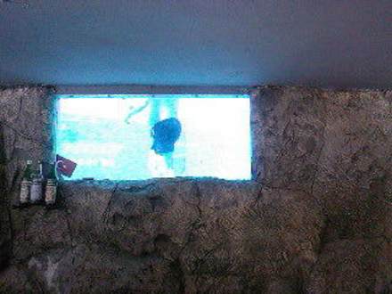 l'intérieur du bar de la piscine du bas où l'on peut voir une fenêtre donnant sur les profondeurs de la piscine du haut et bien entendu les nageurs