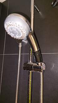 Stark verkalte Duschbrause, die am Gewinde undicht ist und notdürftig mit Klebeband geflickt wurde...