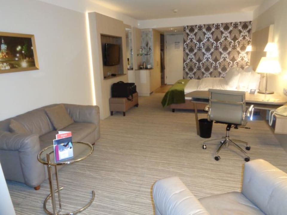 Zimmergroßes Zimmer mit einer etwas auffälligen Wandtapete