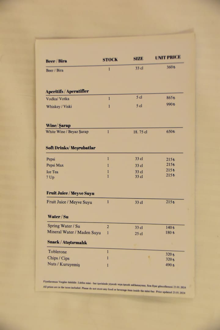 Preisliste der Minibar