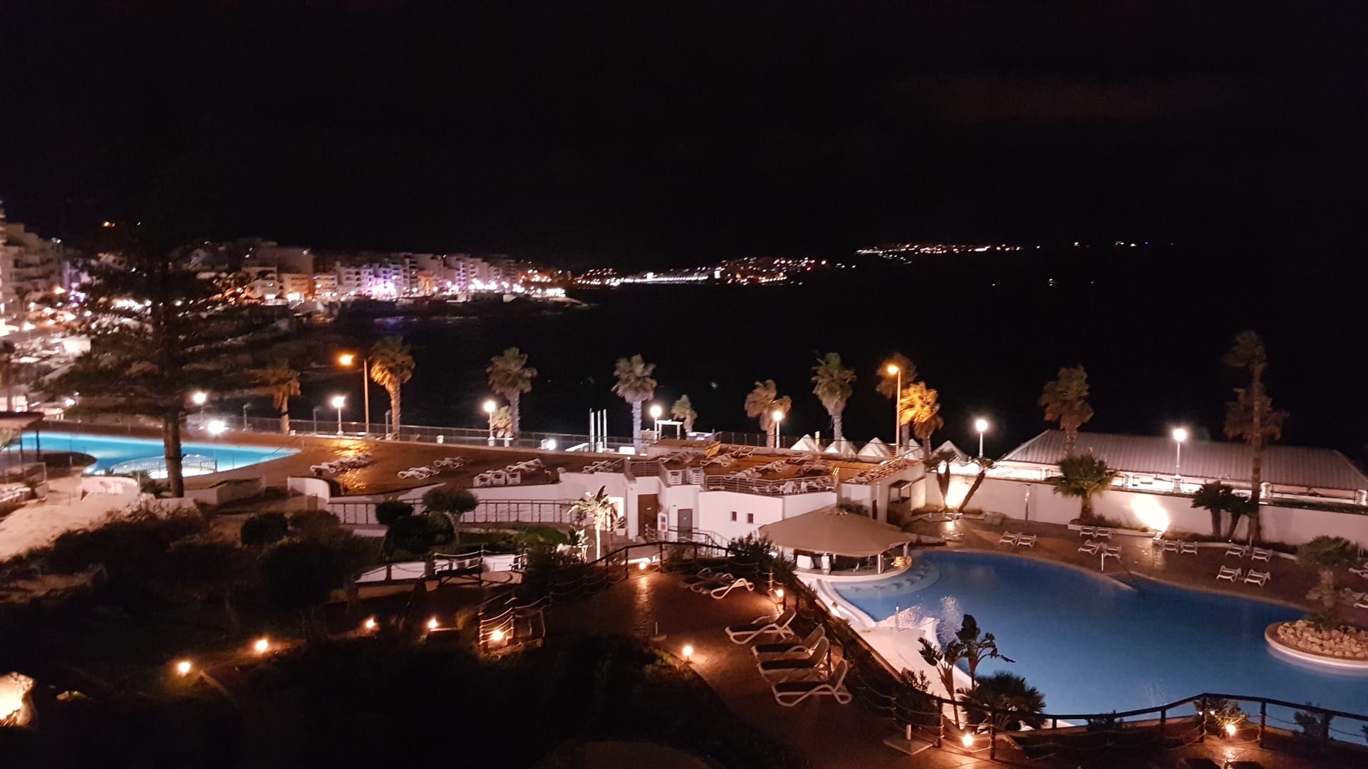 Poolanlage bei Nacht.