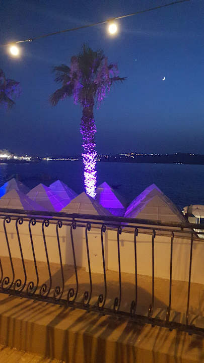 Abends der schön beleuchtete Hotelstrand.