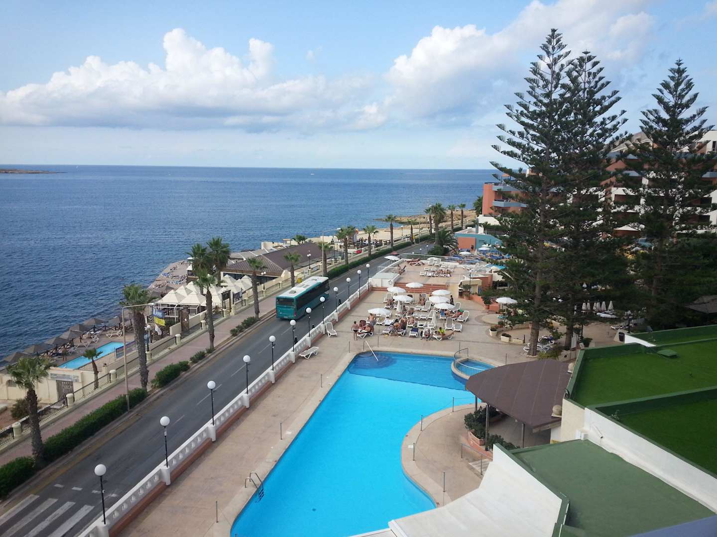 Blick vom Zimmer auf Pool und Meer