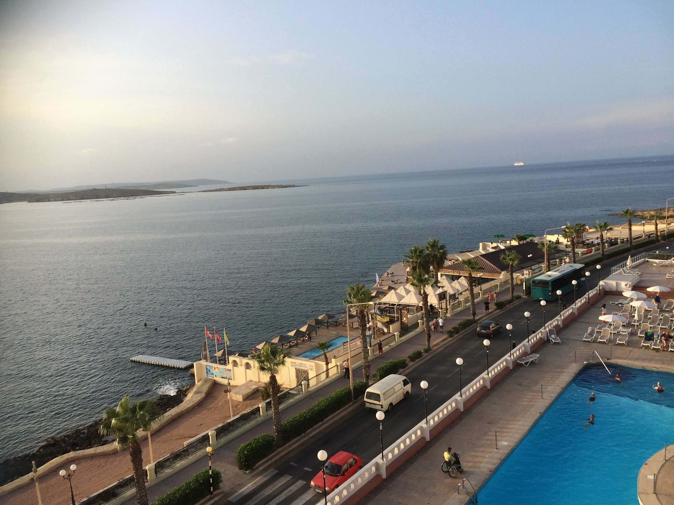 Blick vom Zimmer auf Pool und Meer
