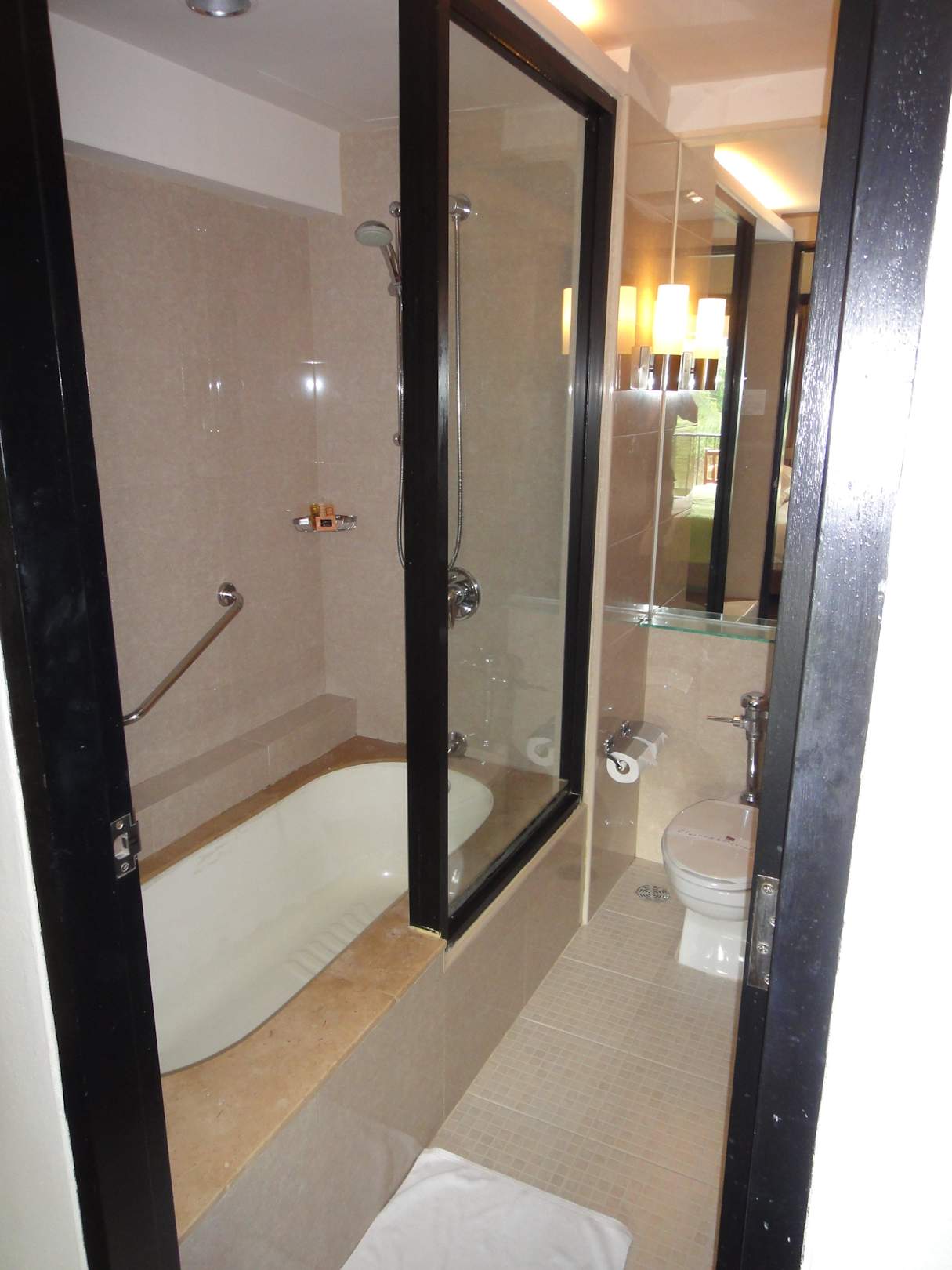 Enges Baddas Bad ist sehr schmal und das Waschbecken ist in eine Nische ins Zimmer intergriert