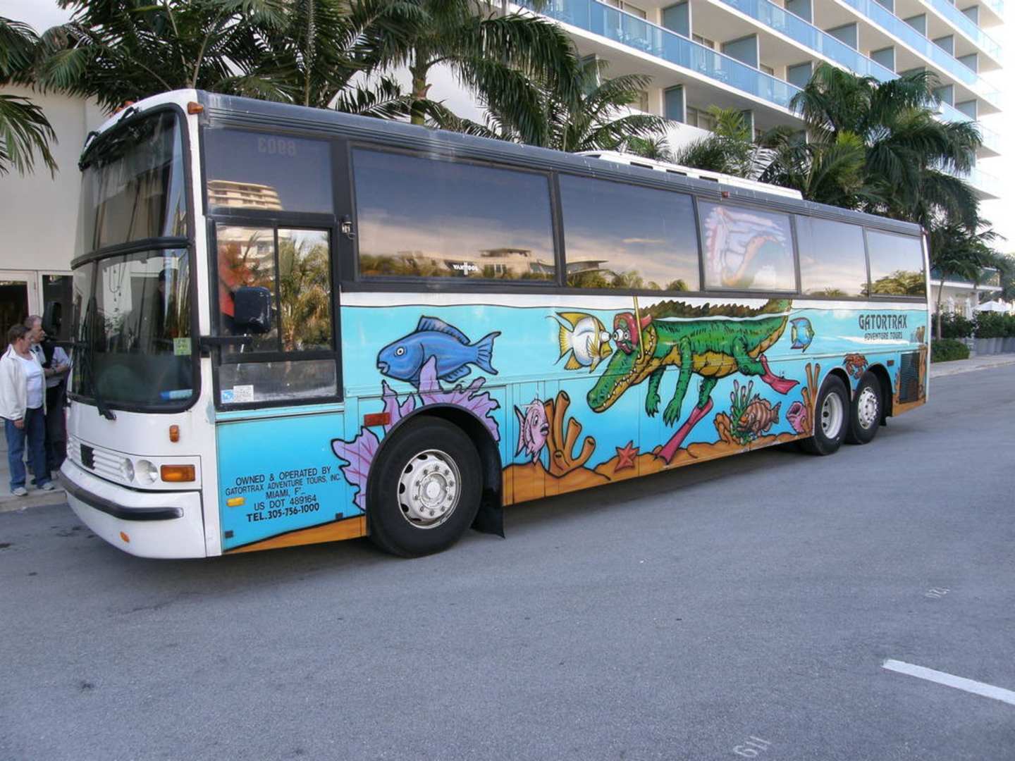 Lustiger Ausflugsbus vor dem Hotelseiteneingang