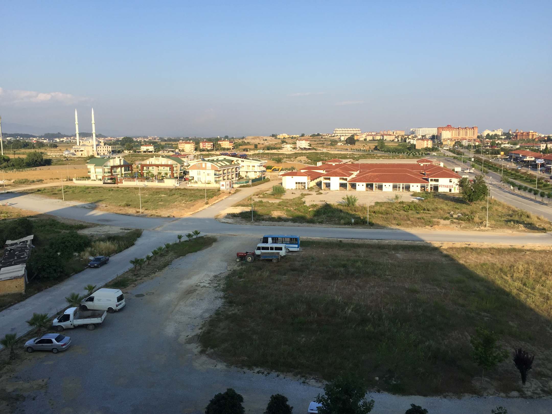 Blick von unserem Balkon: die Moschee oben links, eine Bauruine daneben. Die stark frequentierte Straße liegt daneben. Weiter links liegt der "Club Laguna".