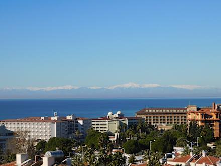 beeindruckende Weitsicht Richtung Meer, in der Ferne die schneebedeckten Berggipfel