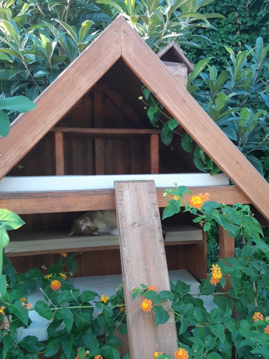 Katzenhaus mit Bewohner, der noch müde von der Nacht war