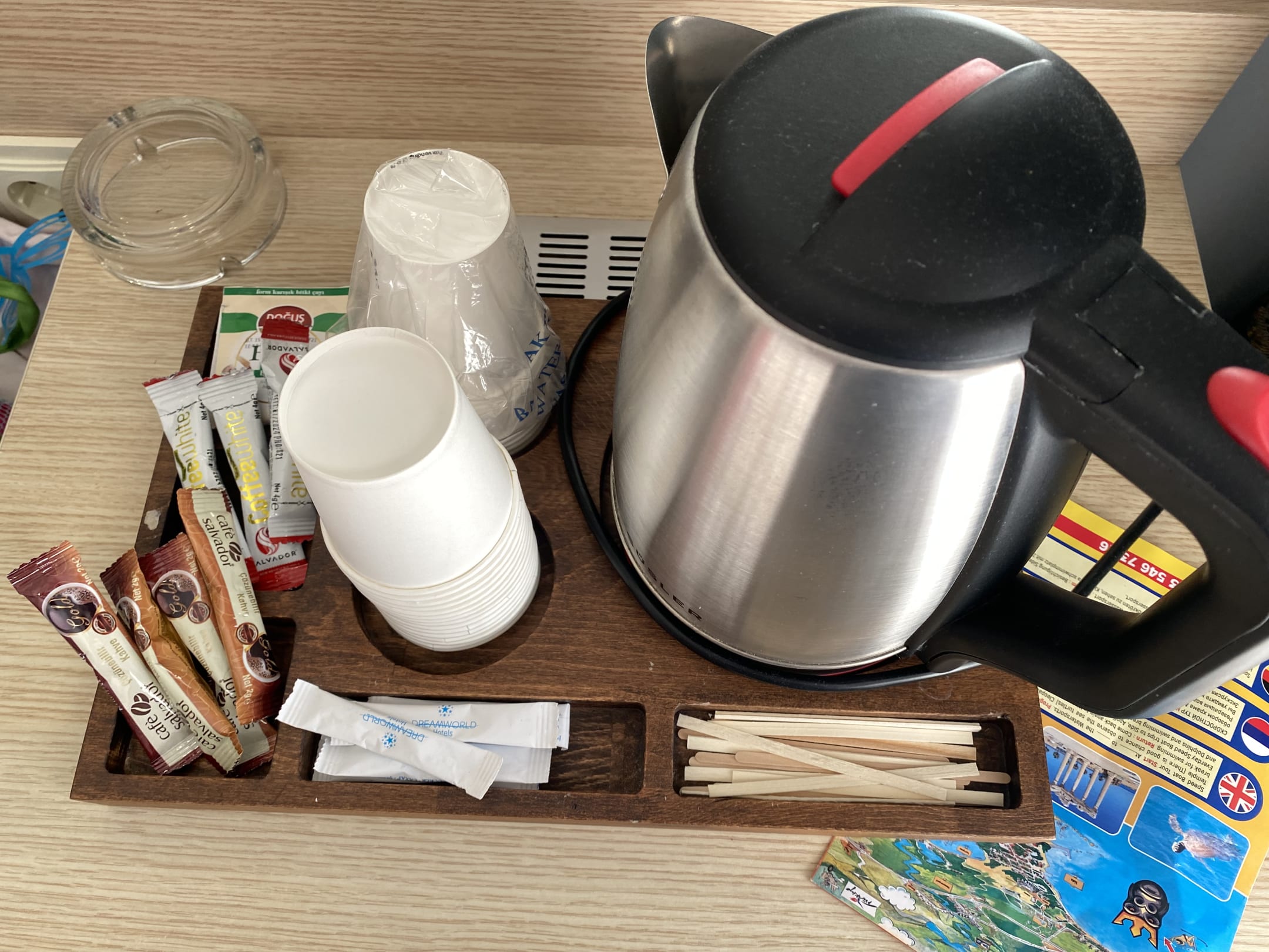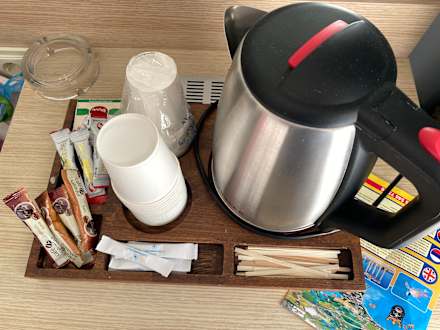 Sauberer Wasserkocher und eine kleine Auswahl an Tee und Kaffee