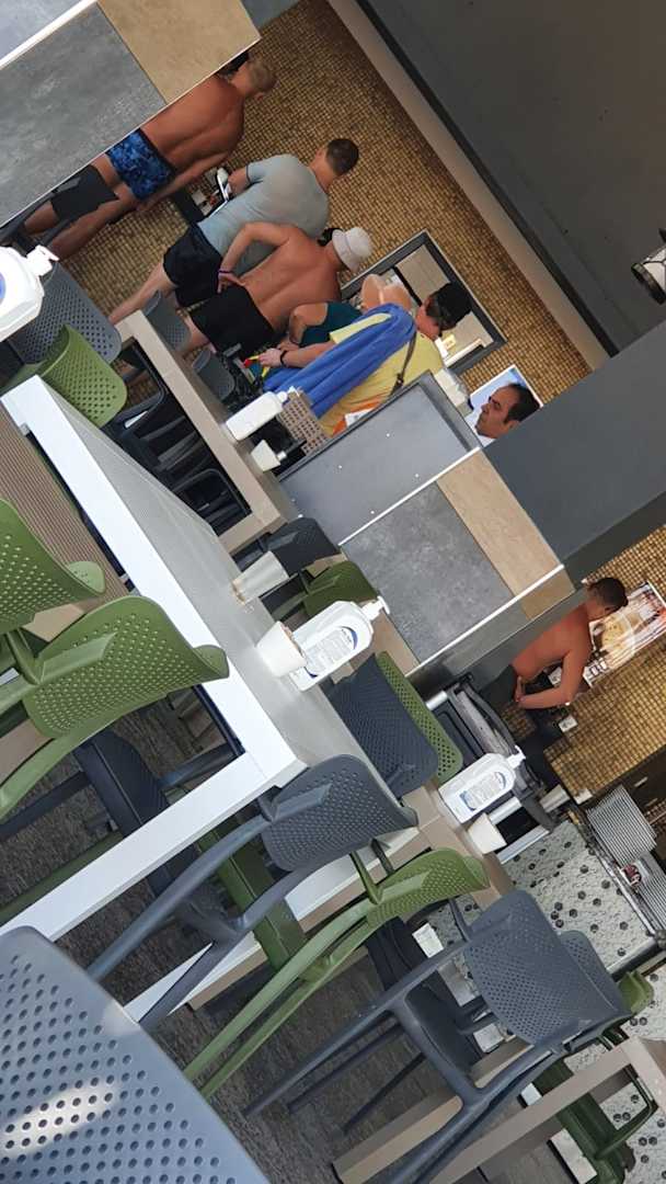 Poolbar / keiner trägt Maske, keine Hygienemaßnahmen, offenes Buffet, jeder fasst alles an.