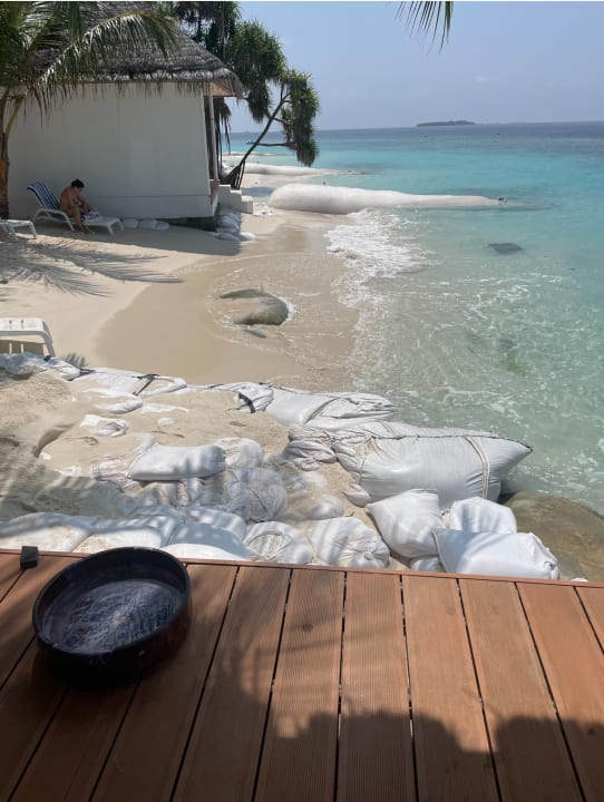 04/2024 Strandsituation Beach Bungalows. Leider werden diese Bungalows (ca. die Hälfte der Beachbungalows sind betroffen) auch weiterhin vermietet. Der Strand vor den Bungis wird versucht, mit Sandsäcken irgendwie zusammen zu halten