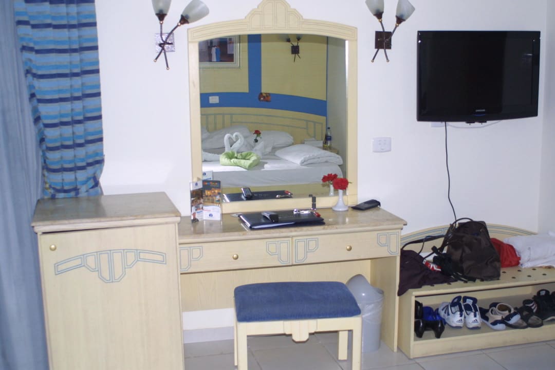 Schreibtisch, Kühlschrank und TV