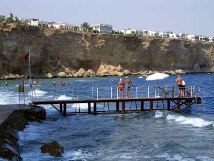 Gleich gehts ins WasserSteg über das Riffdach ins Wasser. Oben auf den Klippen liegt die Hotelanlage.