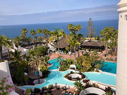 Ausblick auf die Pools und Außengastro