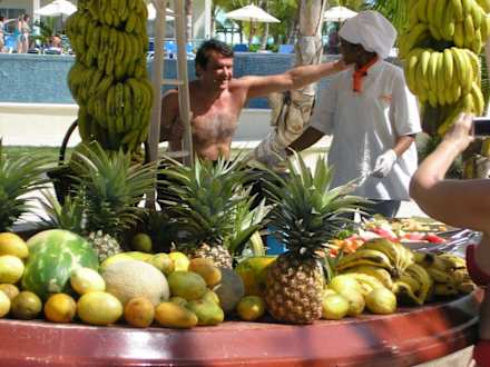 Barque de fruits sur la plage de l'hôtel