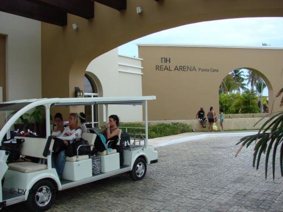 Nach dem Einchecken an der Rezeption wird man per Golfwagen zu seinem Zimmer gebracht. Die Koffer bleiben bis zum Einchecken vor der Tür und werden dort bewacht.