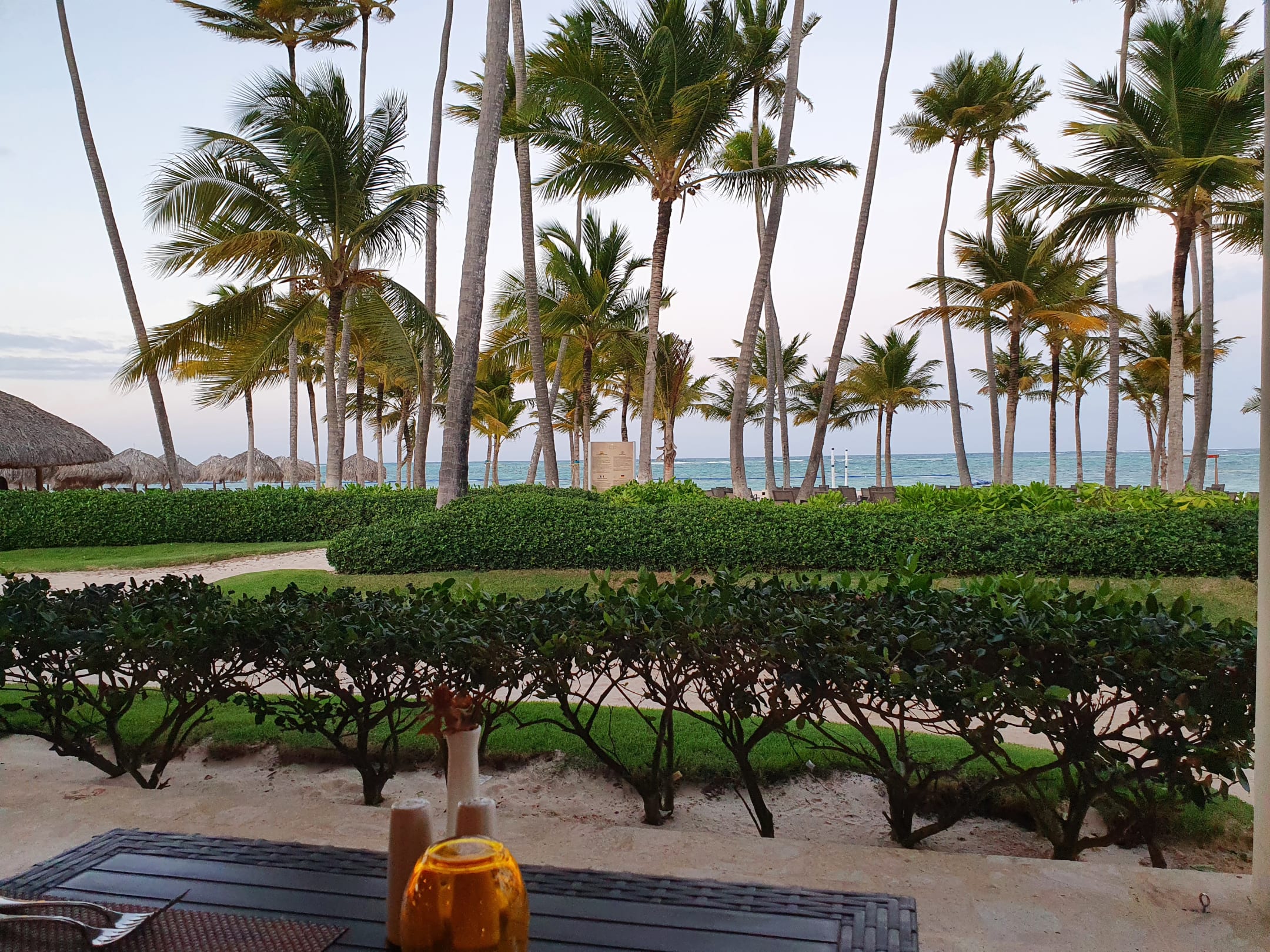 Blick von der Terrasse des Hauptrestaurants auf den Strand des Hotels