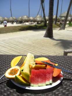 Mein Mittagessen am StrandAnanas, Mango, Papaya, Melonen, Passionsfrucht